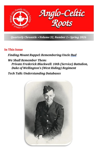 Anglo-Celtic RootsThe Spring 2026 ACR is on the website for members to view. The mailing has been delayed a bit as a result of an issue with the online application for mailing at Canada Post. We apologize for the delay. Deadline for the summer issue is 22 April. Consider sharing one of your family stories! |